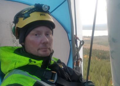 Greger Nilsson, CEO and owner of Blade Solutions, spends much of his working time, hanging in wind turbines, in ropes connected 100 meters up in the air.